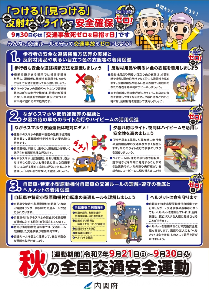 9月21日(日曜日)から30日(火曜日)までの10日間、「秋の全国交通安全運動」が全国一斉に展開されます。