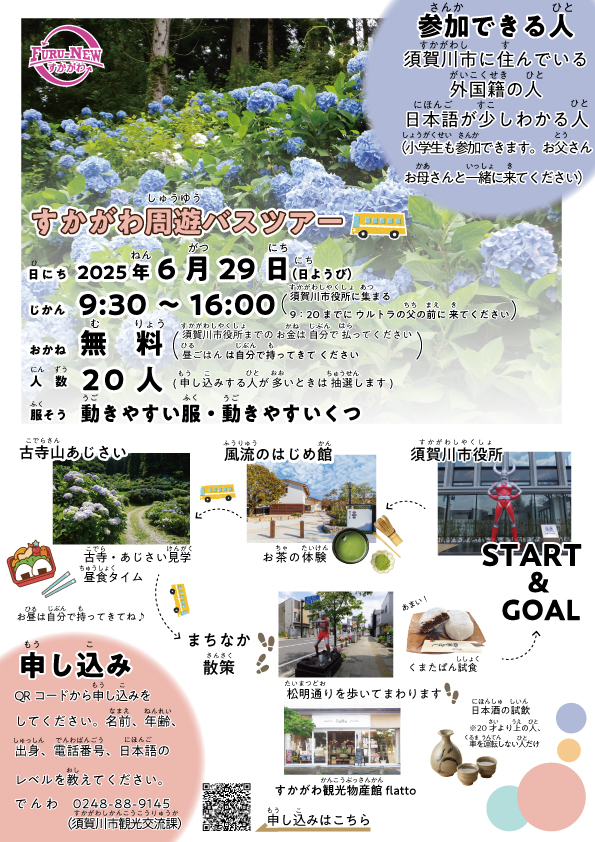 福島県内(ふくしまけんない) に 住(す)んでいる 外国人(がいこくじん)向(む)け の ツアーを 開催(かいさい)し、参加者(さんかしゃ)の みなさん に、須賀川市(すかがわし)の 魅力(みりょく)に ついての コメント や 写真(しゃしん)、動画(どうが)など を SNSで 発信(はっしん)してもらうことで、須賀川市(すかがわし)の PR を、日本国内(にほんこくない)、海外(かいがい) へ 行(おこな)うこと を 目的(もくてき)としています。