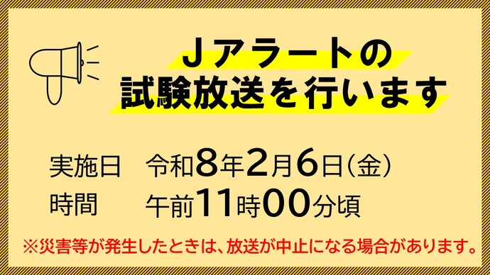 全国瞬時警報システム(Jアラート)による全国一斉の伝達試験のため、防災行政無線スピーカーから試験放送が流れます。Jアラートからの緊急情報を皆様へ確実にお伝えするための定期試験ですので、ご理解とご協力をお願いします。