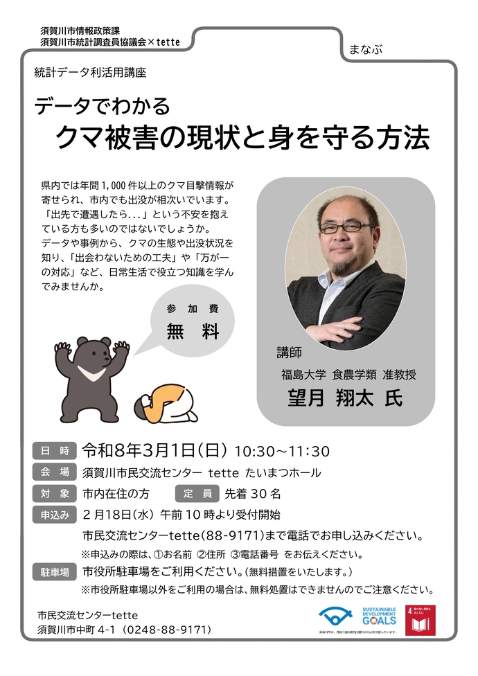 須賀川市情報政策課・須賀川市統計調査員協議会とtetteの連携講座「データでわかる クマ被害の現状と身を守る方法」を開催します。