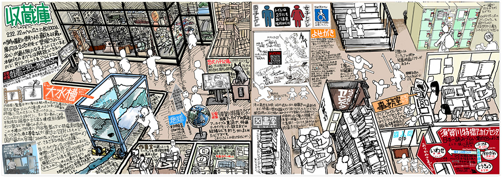 映画監督・特技監督の樋口真嗣氏による館内ガイドマップです。 当センターが細かい部分までよく分かります。